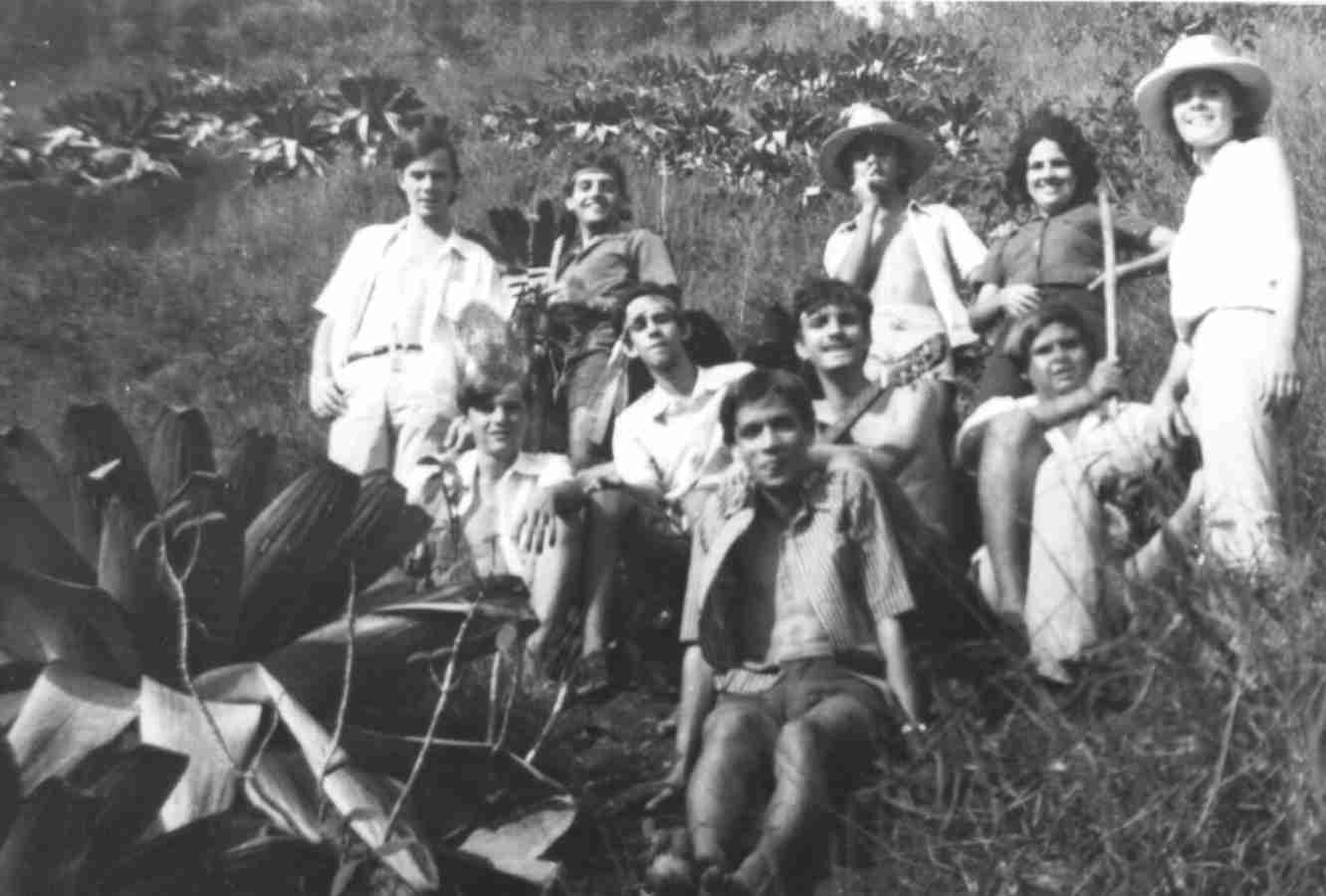 Sentados (esquerda para a direita) : Celso Pinto, Álvaro Nogueira, Dr. Jorge Sobral Venâncio (com violão), Joel do Coutinho (segurando um pedaço de pau, como se fosse uma espada).
